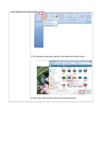 Modul Aplikasi Komputer Microsoft office word 2007 3. Pilih gambar yang anda inginkan. Kemudian klik tombol Insert. 4. Kemudian pilih gambar yang akan dicrop/dipotong.