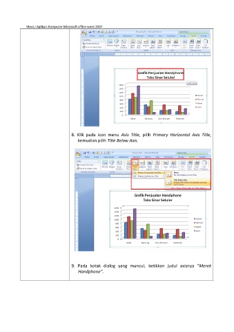 Modul Aplikasi Komputer Microsoft office word 2007 8. Klik pada icon menu Axis Title, pilih Primary Horizontal Axis Title, kemudian pilih Title Below Axis. 9. Pada kotak dialog yang muncul, ketikkan judul axisnya “Merek Handphone”.