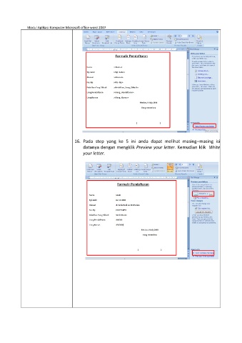 Modul Aplikasi Komputer Microsoft office word 2007 16. Pada step yang ke 5 ini anda dapat melihat masing–masing isi datanya dengan mengklik Preview your letter. Kemudian klik Write your letter.