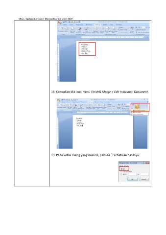 Modul Aplikasi Komputer Microsoft office word 2007 18. Kemudian klik icon menu Finish& Merge > Edit Individual Document. 19. Pada kotak dialog yang muncul, pilih All . Perhatikan hasilnya.