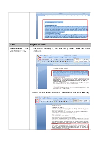 Materi Langkah Detailnya Memindahkan Dan 1. Pilih/seleksi paragraf 1, klik icon cut (Ctrl+X) pada tab ribbon Menduplikasi Teks. clipboard. 2. Letakkan kursor diakhir dokumen. Kemudian Klik icon Paste (Ctrl + V).