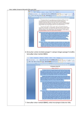 Modul Aplikasi Komputer Microsoft office word 2007 6. Kemudian seleksi kembali paragraf 1 sampai dengan paragraf terakhir, kemudian tekan tombol Ctrl+J. 7. Kemudian tekan tombol Ctrl+S, untuk menyimpan dokumen kita.