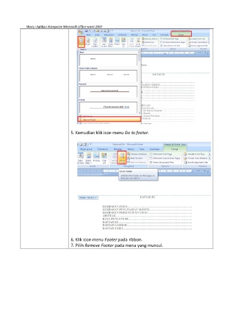 Modul Aplikasi Komputer Microsoft office word 2007 5. Kemudian klik icon menu Go to footer. 6. Klik icon menu Footer pada ribbon. 7. Pilih Remove Footer pada menu yang muncul.