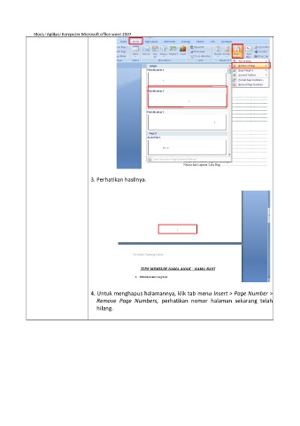 Modul Aplikasi Komputer Microsoft office word 2007 3. Perhatikan hasilnya. 4. Untuk menghapus halamannya, klik tab menu Insert > Page Number > Remove Page Numbers, perhatikan nomor halaman sekarang telah hilang.