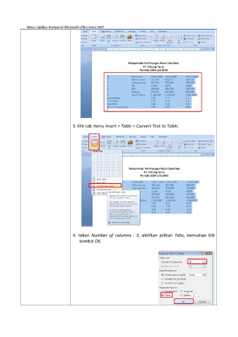 Modul Aplikasi Komputer Microsoft office word 2007 3. Klik tab menu Insert > Table > Convert Text to Table. 4. Isikan Number of columns : 5, aktifkan pilihan Tabs, kemudian klik tombol OK.