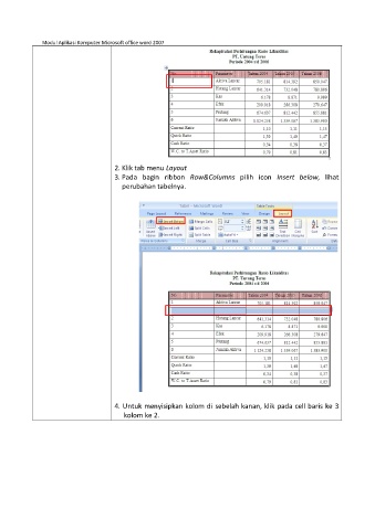 Modul Aplikasi Komputer Microsoft office word 2007 2. Klik tab menu Layout 3. Pada bagin ribbon Row&Columns pilih icon Insert below, lihat perubahan tabelnya. 4. Untuk menyisipkan kolom di sebelah kanan, klik pada cell baris ke 3 kolom ke 2.