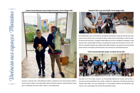 Viv%u00eancia nos espa%u00e7os MaristasCentro Social Marista Santa Isabel (Cemasi), Porto Alegre (RS)Durante o m%u00eas de maio, m%u00eas dedicado %u00e0 Maria, realizamos uma%u00a0emocionante Celebra%u00e7%u00e3o em honra %u00e0 Maria, nossa Boa M%u00e3e. Neste momento especial, cada educando trouxe para a celebra%u00e7%u00e3o seu amor filial %u00e0 Maria e suas esperan%u00e7as.Hospital S%u00e3o Lucas da PUCRS, Porto Alegre (RS)No Hospital S%u00e3o Lucas, entre diversas atividades realizadas ao longo do m%u00eas de maio, destacou-se uma missa com a coroa%u00e7%u00e3o de Maria, Nossa Senhora Boa M%u00e3e, no final do m%u00eas. Durante todo o per%u00edodo, a imagem da Boa M%u00e3e percorreu as unidades do Hospital, e cada pessoa teve a opotunidade de deixar um pedido de ora%u00e7%u00e3o, que foi levado %u00e0 missa. Tamb%u00e9m foi realizada a b%u00ean%u00e7%u00e3o da Capelinha Boa M%u00e3e Peregrina, que passar%u00e1 continuamente pelos setores do Hospital, permanecendo uma semana em cada departamento.Centro de Juventudes (Ceju), Cruzeiro do Sul (AC)Nos dias 3, 4 e 5 de maio, ocorreu, na Comunidade Marista de Cruzeiro do Sul (AC), o Encontro Vocacional Marista. Na ocasi%u00e3o, tamb%u00e9m foi celebrado o Dia Marista de Nossa Senhora Boa M%u00e3e, com uma celebra%u00e7%u00e3o na Comunidade Cat%u00f3lica S%u00e3o Sebasti%u00e3o, que contou com a participa%u00e7%u00e3o do Centro de Juventudes (Ceju).