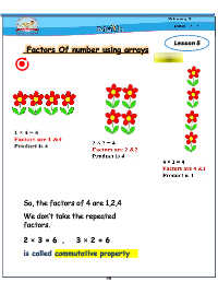 Factors Of number using arrays Lesson 5 So, the factors of 4 are 1,2,4 We don’t take the repeated factors. 2×3=6 , 3×2=6 is called acommutative property 44