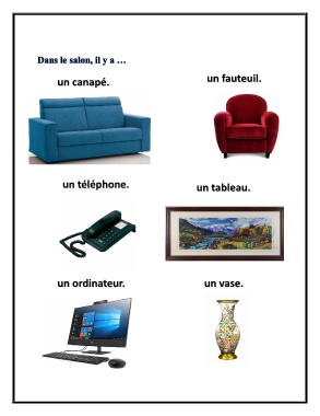 un canapé. un fauteuil. un téléphone. un tableau. un ordinateur. un vase.
