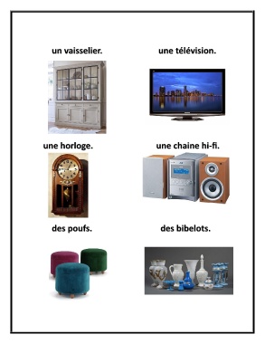 un vaisselier. une télévision. une horloge. une chaine hi-fi. des poufs. des bibelots.