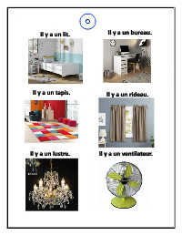 Il y a un lit. Il y a un bureau. Il y a un tapis. Il y a un rideau. Il y a un lustre. Il y a un ventilateur.