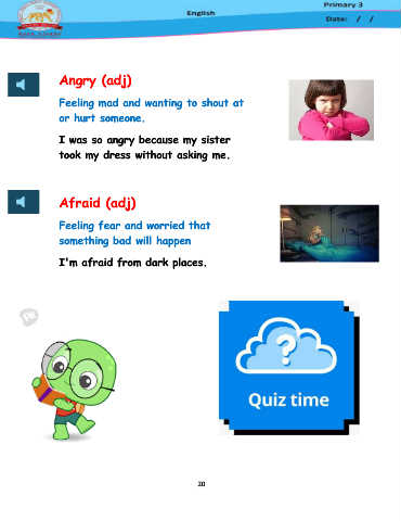 Angry (adj) Feeling mad and wanting to shout at or hurt someone. I was so angry because my sister took my dress without asking me. Afraid (adj) Feeling fear and worried that something bad will happen I'm afraid from dark places. 20