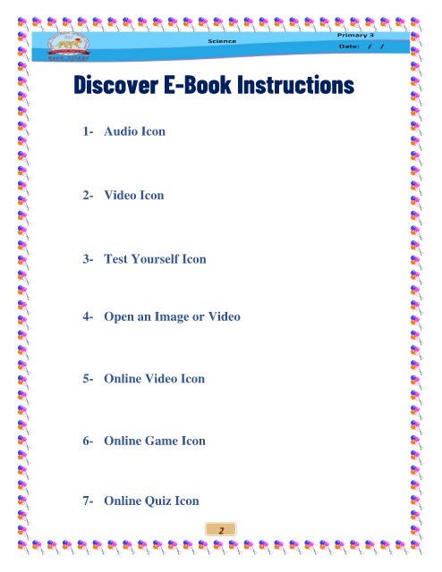 Discover E-Book Instructions 1- Audio Icon 2- Video Icon 3- Test Yourself Icon 4- Open an Image or Video 5- Online Video Icon 6- Online Game Icon 7- Online Quiz Icon 2