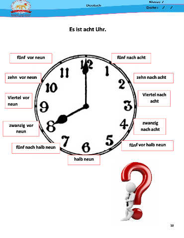 Es ist acht Uhr. fünf vor neun fünf nach acht zehn vor neun zehn nach acht Viertel vor Viertel nach neun acht zwanzig vor zwanzig neun nach acht fünf nach halb neun fünf vor halb neun halb neun 10
