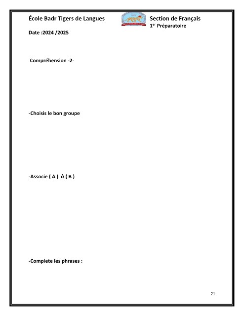 École Badr Tigers de Langues Section de Français Date :2024 /2025 1er Préparatoire Compréhension -2- -Choisis le bon groupe -Associe ( A ) ? ( B ) -Complete les phrases : 21