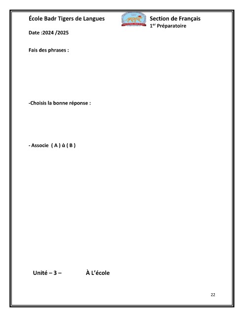 École Badr Tigers de Langues Section de Français Date :2024 /2025 1er Préparatoire Fais des phrases : -Choisis la bonne réponse : - Associe ( A ) ? ( B ) Unité – 3 – À L’école 22