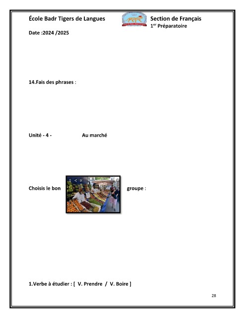 École Badr Tigers de Langues Section de Français Date :2024 /2025 1er Préparatoire 14.Fais des phrases : Unité - 4 - Au marché Choisis le bon groupe : 1.Verbe à étudier : [ V. Prendre / V. Boire ] 28