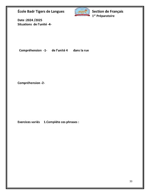École Badr Tigers de Langues Section de Français Date :2024 /2025 1er Préparatoire Situations de l’unité -4- Compréhension -1- de l’unité 4 dans la rue Compréhension -2- Exercices variés 1.Compléte ces phrases : 33