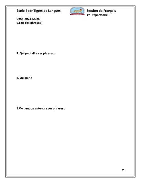École Badr Tigers de Langues Section de Français Date :2024 /2025 1er Préparatoire 6.Fais des phrases : 7. Qui peut dire ces phrases : 8. Qui parle 9.Où peut on entendre ces phrases : 35