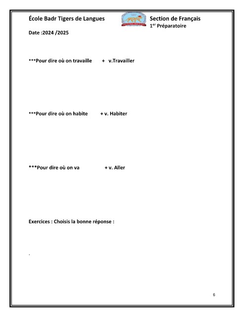 École Badr Tigers de Langues Section de Français Date :2024 /2025 1er Préparatoire ***Pour dire où on travaille + v.Travailler ***Pour dire où on habite + v. Habiter ***Pour dire où on va + v. Aller Exercices : Choisis la bonne réponse : . 6