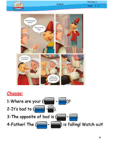 Choose: 1-Where are your (books – toys)? 2-It’s bad to (speak – lie). 3-The opposite of bad is (good – tall). 4-Father! The (table – shelf) is falling! Watch out! 22