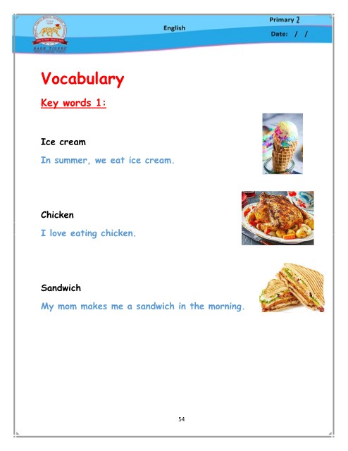 Vocabulary Key words 1: Ice cream In summer, we eat ice cream. Chicken I love eating chicken. Sandwich My mom makes me a sandwich in the morning. 54