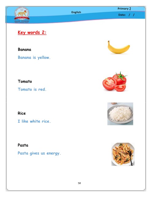 Key words 2: Banana Banana is yellow. Tomato Tomato is red. Rice I like white rice. Pasta Pasta gives us energy. 58