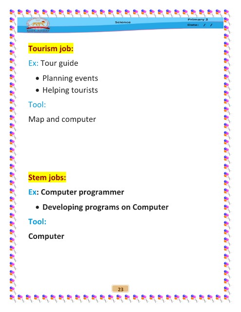 Tourism job: Ex: Tour guide • Planning events • Helping tourists Tool: Map and computer Stem jobs: Ex: Computer programmer • Developing programs on Computer Tool: Computer 23