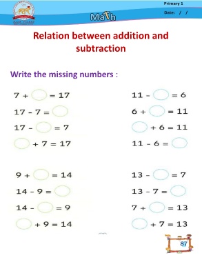 Relation between addition and subtraction Write the missing numbers : 87