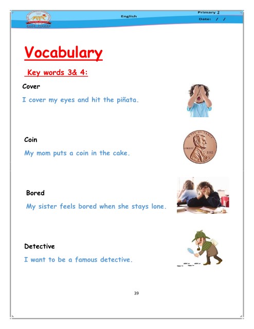 Vocabulary Key words 3& 4: Cover I cover my eyes and hit the piñata. Coin My mom puts a coin in the cake. Bored My sister feels bored when she stays lone. Detective I want to be a famous detective. 39