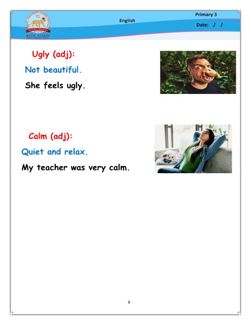 Ugly (adj): Not beautiful. She feels ugly. Calm (adj): Quiet and relax. My teacher was very calm. 6