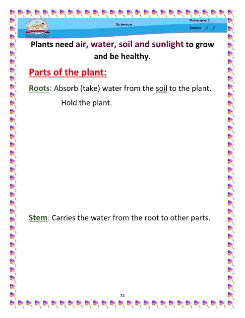 Plants need air, water, soil and sunlight to grow and be healthy. Parts of the plant: Roots: Absorb (take) water from the soil to the plant. Hold the plant. Stem: Carries the water from the root to other parts. 24