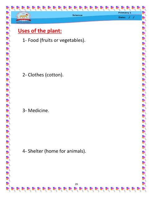 Uses of the plant: 1- Food (fruits or vegetables). 2- Clothes (cotton). 3- Medicine. 4- Shelter (home for animals). 26