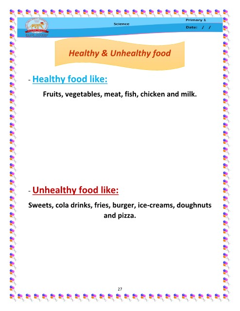 Healthy & Unhealthy food - Healthy food like: Fruits, vegetables, meat, fish, chicken and milk. - Unhealthy food like: Sweets, cola drinks, fries, burger, ice-creams, doughnuts and pizza. 27