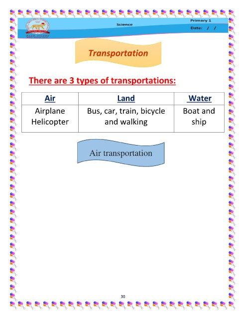 Transportation There are 3 types of transportations: Air Land Water Airplane Bus, car, train, bicycle Boat and Helicopter and walking ship Air transportation 30