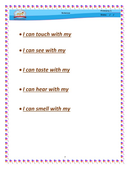 • I can touch with my • I can see with my • I can taste with my • I can hear with my • I can smell with my 7