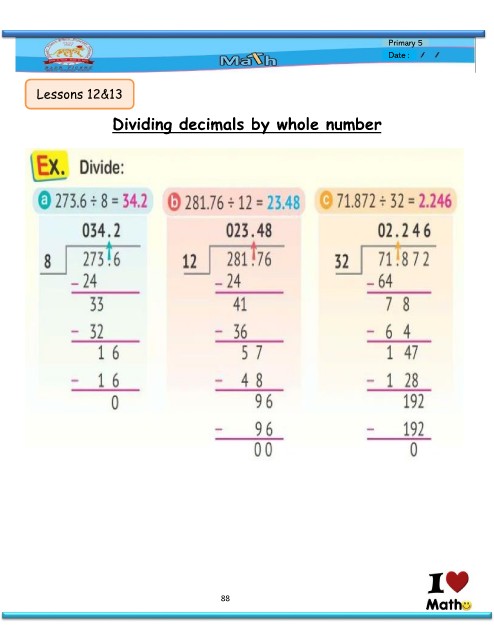 Primary 5 Date : Lessons 12&13 Dividing decimals by whole number 88