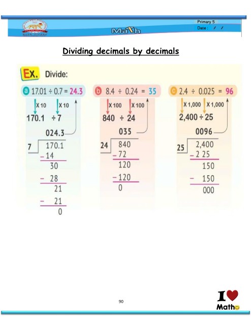 Primary 5 Date : Dividing decimals by decimals 90