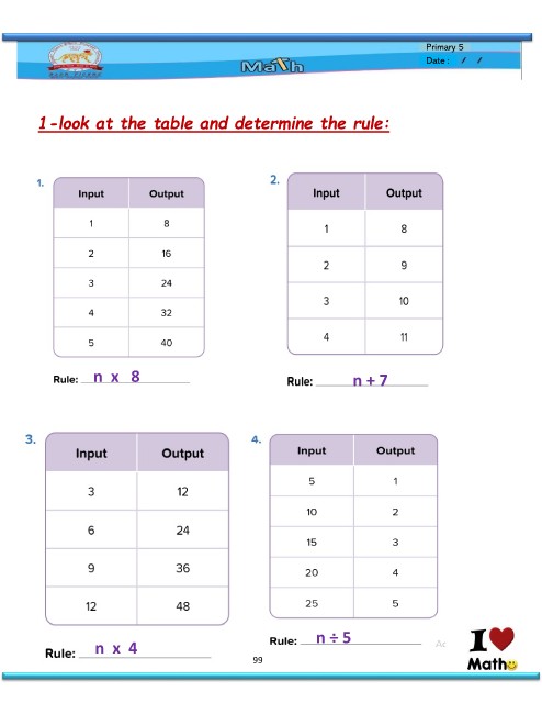 Primary 5 Date : 1-look at the table and determine the rule: nx 8 n+7 nx4 n÷5 99