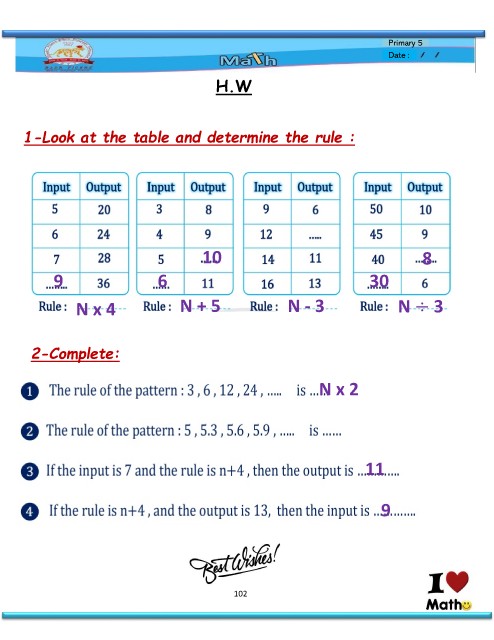 Primary 5 Date : H.W 1-Look at the table and determine the rule : 9 10 8 Nx4 6 30 N-3 N÷3 2-Complete: N+5 Nx2 11 9 102