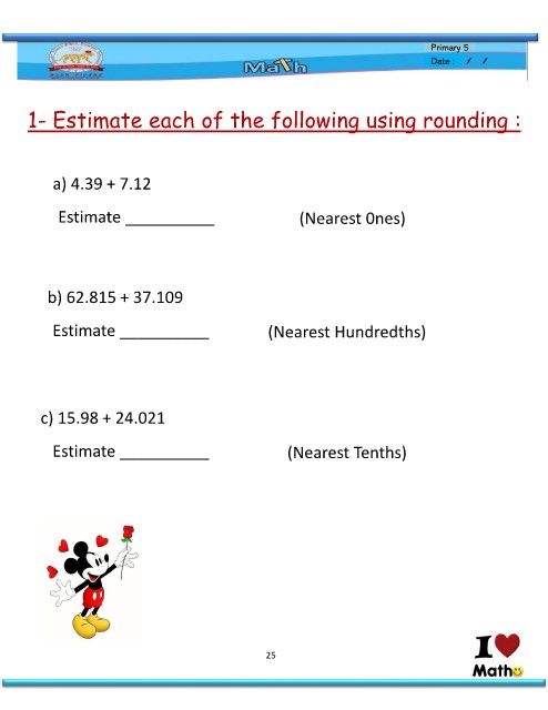 Primary 5 Date : 1- Estimate each of the following using rounding : a) 4.39 + 7.12 (Nearest 0nes) Estimate __________ b) 62.815 + 37.109 (Nearest Hundredths) Estimate __________ c) 15.98 + 24.021 (Nearest Tenths) Estimate __________ 25