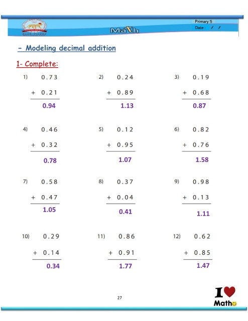 - Modeling decimal addition Primary 5 Date : 1- Complete: 0.94 1.13 0.87 1.58 0.78 1.07 1.11 1.47 1.05 0.41 0.34 1.77 27
