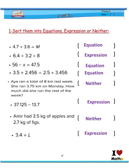 Primary 5 Date : 1-Sort them into Equations, Expression or Neither: Equation Expression Equation Equation Neither Expression Neither Expression 37