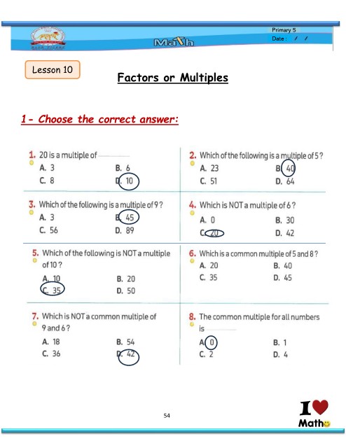 Primary 5 Date : Lesson 10 Factors or Multiples 1- Choose the correct answer: 54