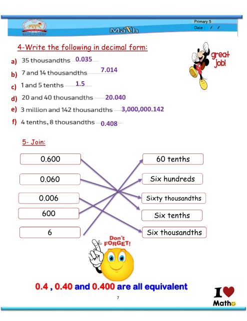 Primary 5 Date : 4-Write the following in decimal form: a) 0.035 b) 7.014 c) 1.5 d) 20.040 e) 3,000,000.142 f) 0.408 5- Join: 60 tenths 0.600 0.060 Six hundreds 0.006 600 Sixty thousandths 6 Six tenths Six thousandths 7