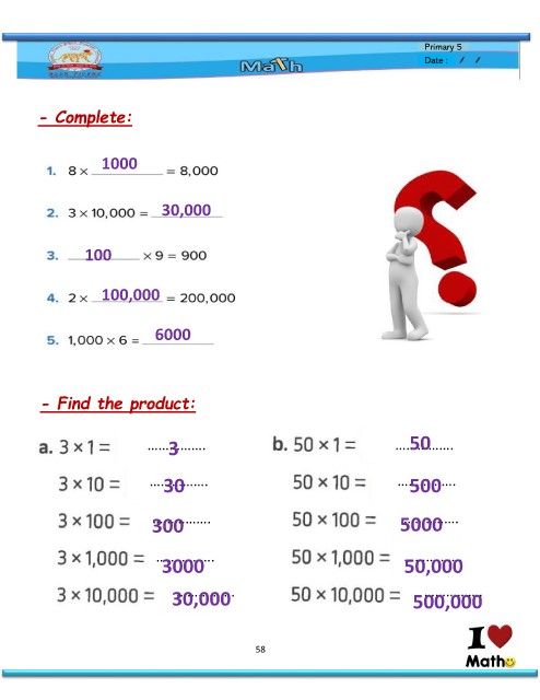 - Complete: Primary 5 Date : 1000 ……5…0……. 30,000 ……5…0…0…. 100 5…0…0…0……. …5…0,…0…0…0. 100,000 6000 50…0…,…0…0…0. - Find the product: ……3………. ……3…0……. 3…0…0………. …3…0…0…0…. 3…0…,…0…0…0. 58