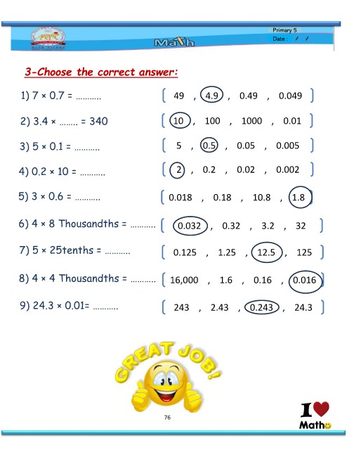 3) 5 × 0.1 = ……….. 5 , 0.5 , 0.05 , 0.005