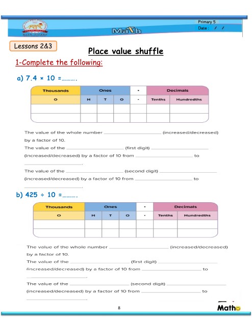 Primary 5 Date : Lessons 2&3 Place value shuffle 1-Complete the following: a) 7.4 × 10 =………. b) 425 ÷ 10 =………. 8