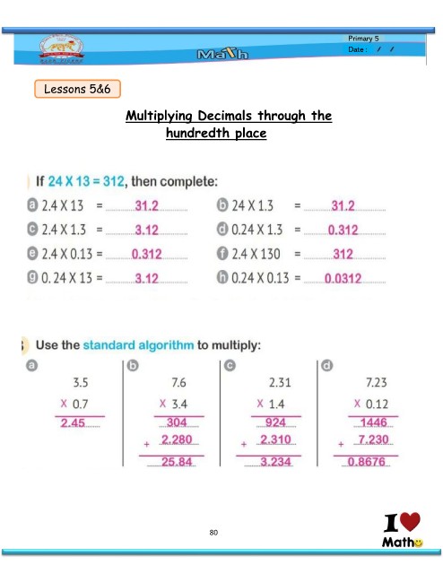 Primary 5 Date : Lessons 5&6 Multiplying Decimals through the hundredth place 80