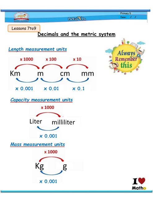 Primary 5 Date : Lessons 7to9 Decimals and the metric system Length measurement units x 0.001 x 0.01 x 0.1 Capacity measurement units Liter milliliter x 0.001 Mass measurement units Kg g 81 x 0.001 x 0.01 x 0.1